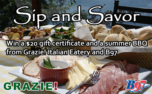 Listen to Pam Thrash weekdays from 10 to Noon for the "Sip and Savor with Grazie! Contest". Caller #9 will win a $20 gift certificate to Grazie! and be registered to win the grand prize of a catered dinner party for up to 20 people! You can also sign up here