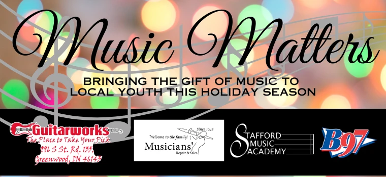 This holiday season, B97 is partnering with GuitarWorks, Musician's Repair and Sales, and Stafford Music Academy to give the gift of music to fifteen youth in our community. Instruments for the campaign are provided by GuitarWorks in Greenwood, IN and Musician's Repair and Sales in Indianapolis, IN. The selection includes new and used/refurbished instruments: acoustic guitar, violin, viola, trumpet, clarinet, trombone, and flute. Winners will also receive instruction books and 6 months of lessons from Stafford Music Academy in Bloomington, IN. Thank you to our supporting sponsors: Rapid Roofing & Restoration and Coghlan Orthodontics.